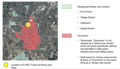 The map shows Mixed-Use Centers in green. The site is in yellow and is NOT located in any Mixed-Use Center. Even if you want to count Downtown Raleigh which is maroon as a Mixed-Use Center, the site is NOT in its core, it is clearly on the fringe.