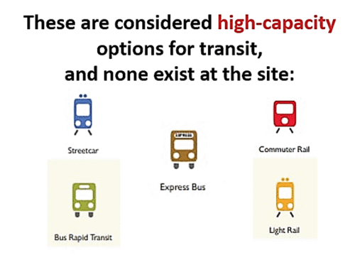 The staff report includes a list of bus routes that serve the site. Only 2 of them actually operate at this property. While one is frequent, NEITHER of them meet the definition of HIGH-CAPACITY (e.g. larger buses, dedicated lanes, enhanced stations).