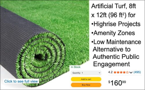 When a developer asks for support from council, there were to be significant benefits to the community, but we the voters get only Astroturf, artwork, and a bench? Other cities have received ice skating rinks and, at a minimum, public bathrooms. The council needs to get developers to provide infrastructure and get significant benefits as it says in the plan.