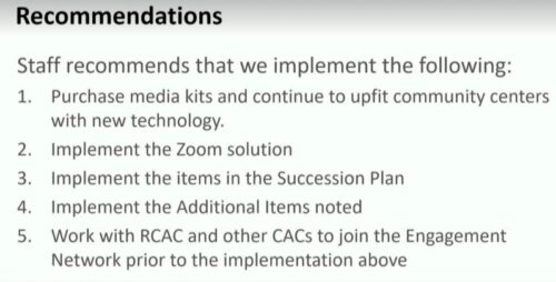 Hopefully, that will all change today. Instead of just hearing what has been proposed by Community Engagement and the City Manager’s office, you will actually hear the other side of the discussion from Robert’s viewpoint, representing both the RCAC and its member CAC organizations.