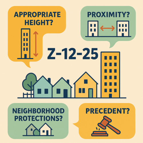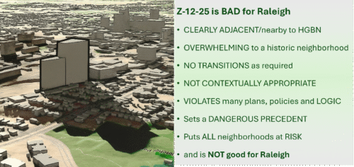 The debate over rezoning case Z-12-25 is not about whether Raleigh should grow. It is about how we grow and whether our city will uphold its own planning framework, respect its historic neighborhoods, and avoid precedents that undermine livability across Raleigh. At the heart of this case are questions of appropriate height, proximity, neighborhood protections, and precedent.