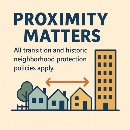 Policy analysis confirms that HGBN is nearby/adjacent to the rezoning site. Additionally, it is only 45 to 90 feet outside the 150-foot Edge condition, which limits height to four stories. This is nearby and close proximity by any reasonable definition, which means that all transition and historic neighborhood protection policies apply.